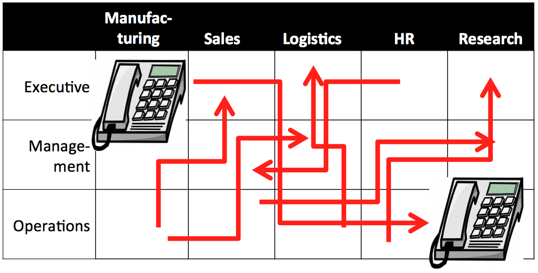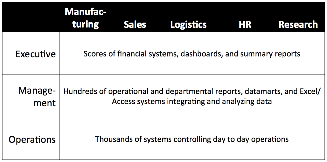 In the first picture we see the traditional layers of an organization. The Operations layer consists of the systems and processes that do day to day work, usually narrowly focused on a single process, like payroll or shipping for example, and individual objects and events, like paychecks or packages. The Management layer observes the workings of operational processes and coordinates them with each other, and hence typically supports a large number of reports, spreadsheets, and datamarts that provide information on operational processes. Finally, the Executive layer aggregates data collected from Management, summarizing process detail contained in Management reporting to understand overall status, trends, and outliers that might indicate specific risks or issues.