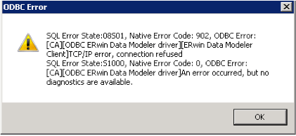 ERwin_rX_Current, where X is the version number, connects to the model currently open on the user’s desktop. If more than one model is open, then it defaults to the one opened earliest. The Version 8 CA ERwin Modeler ODBC Reporting guide provides information how to point ERwin_rX_Current to a non-default model. You’ll get the error message shown if you try to open ERwin_rX_Current without having an ERwin model open first.